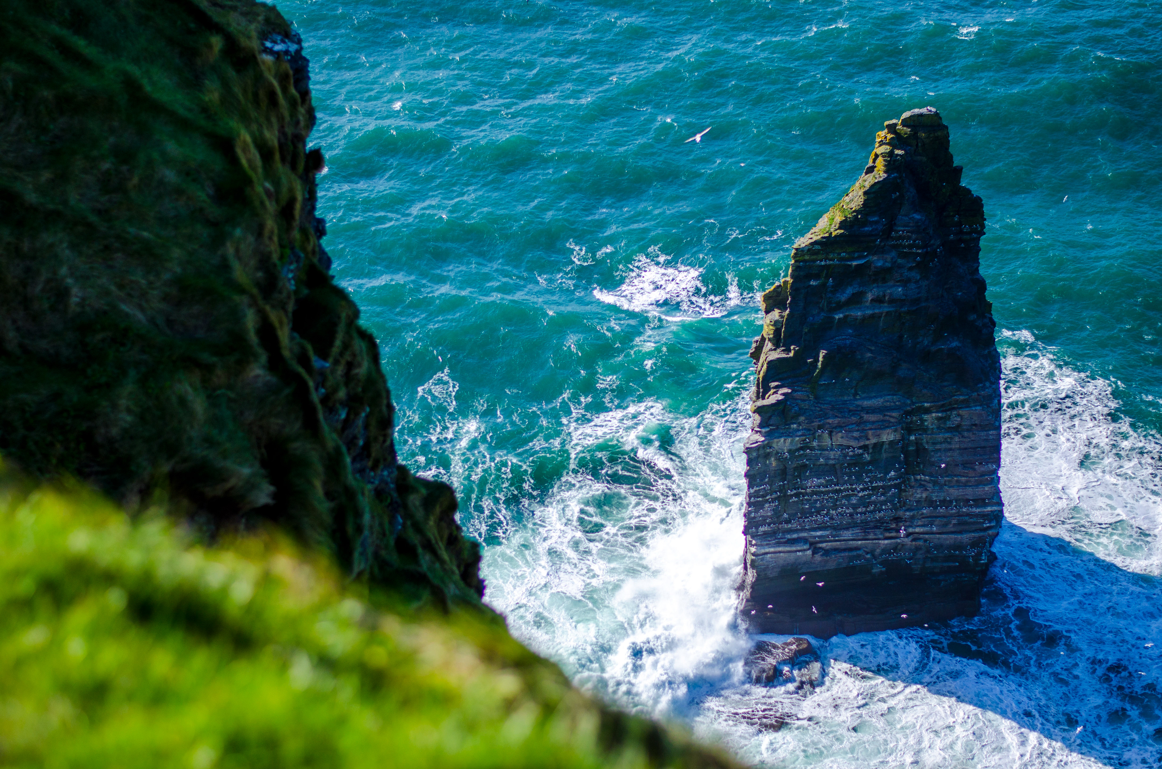 The photo was taken during a day trip to the Cliffs of Moher in County Clare in April of 2017. The 50mm lens was chosen to take advantage of the fast aperture, blurring out the foreground to focus on the stack. A very fast shutter-speed was also used to freeze the power of the water crashing and the birds flying.