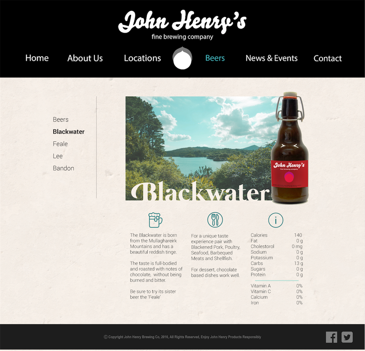 The John Henry Brewing Co website was developed as a group project for a fictional client, John Henry. The project was developed with Ben Clooney and Abbie O' Shea and involved an entire design & development process. The final design is the culmination of research, interest groups, wire-framing, design and client-feedback.